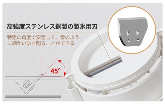 かき氷機の刃物は、45°の特別な角度設計で、雪のような食感のかき氷を提供し、暑い夏に最適な涼しさを提供します。自分で材料を選べるので、安心・安全な無添加ヘルシーアイスが簡単に作ることができます。