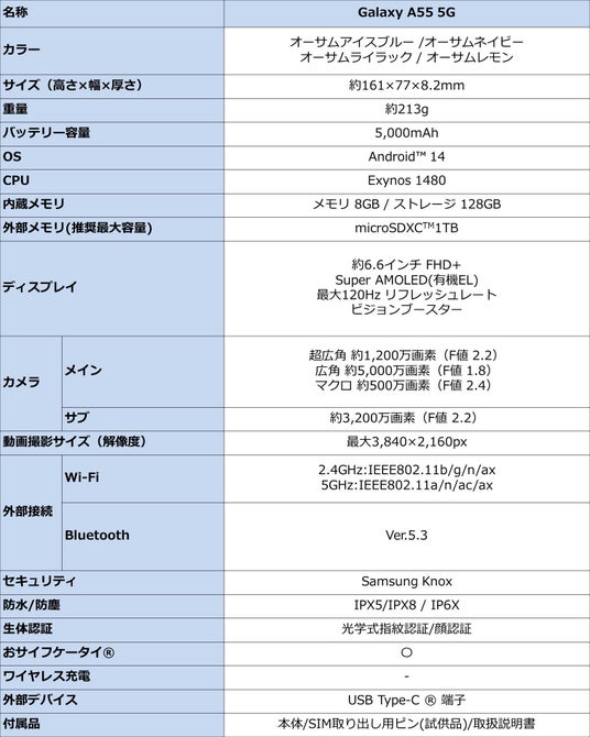 <主な仕様:「Galaxy A55 5G」>