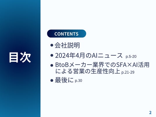 株式会社ベクトル(本社:東京都港区、代表取締役会長兼社長:西江 肇司、東証プライム:6058)の子会社であるOwned株式会社(東京都品川区、代表取締役社長、石井翔、以下「当社」)は、AIの最新トレンドをまとめた「BtoBメーカー業界向けSFA×AIによる営業の生産性向上レポート」の資料の2024年5月版(全30ページ)を無料公開いたしました。