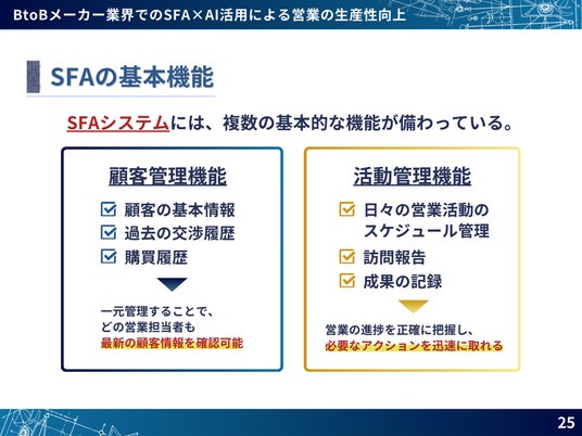 SFA(セールスフォースオートメーション)は、営業活動の効率化を図るためのシステムで、顧客情報の管理、営業プロセスの自動化、パフォーマンスの追跡などを一元的に行うことができます。