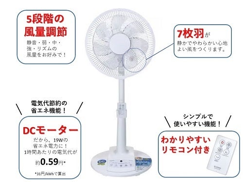 DCモーターだから19Wの省エネ電力になり、1時間あたりの電気代も約0.59円とお得です。扇風機もうまく活用することで電気代を大幅に抑えることができます。