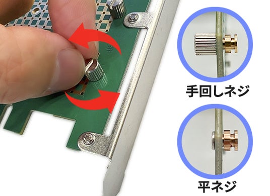 手回しネジで工具不要の簡単セッティング&交換用の平ネジも付属