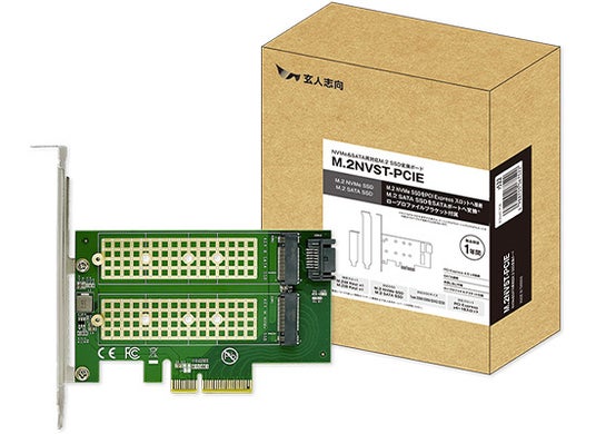 玄人志向から、M.2 NVMe SSDをPCI Express x4に、M.2 SATA SSDをSATAポートに変換する変換ボード『M.2NVST-PCIE』を発売