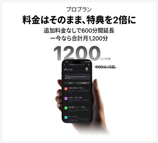 プロプランでは、以前の料金はそのままに内容が2倍(1,200分/月)となり、プロプラン限定のより充実したプレミアムAI機能をお楽しみいただけます。