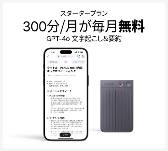 新規でPLAUD NOTEをご購入されると、毎月300分のGPT-4o文字起こし・要約サービスを提供するスタータープランが含まれます。