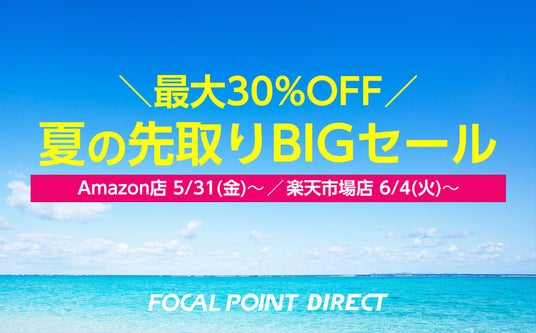 フォーカルポイント株式会社(本社:神奈川県横浜市、代表取締役 恩田英樹 以下フォーカルポイント)は、直営オンラインショップ フォーカルポイント・ダイレクトAmazon店、楽天市場店にて最大30%OFFの夏の先取りBIGセールを開催いたします。また、セール期間が各ショップによって異なりますので、ご注意ください。各ショップのセール開催期間は、以下の通りになります。Amazon店は、一部の商品の期間が異なります。また、楽天市場店は、一部の商品がクーポンセールになります。