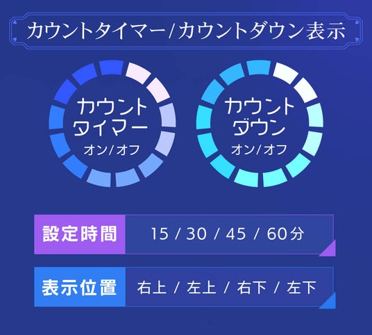 オンとオフの時間を表示するカウントタイマーやカウントダウン表示は、15分刻みで設定することができ、ゲーム中の時間を管理しやすくすることが可能です。また、表示位置を四隅のいずれかに変更することができる為、ゲームによってはタイマーと文字等が被って見づらいといったことが無くなります。