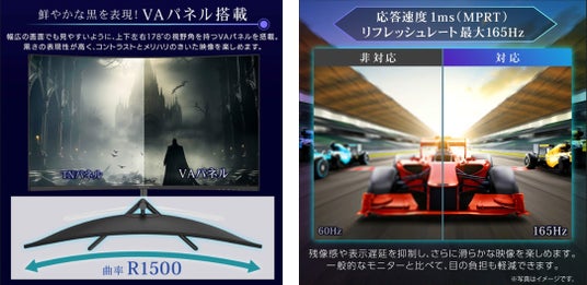 曲率R1500、リフレッシュレート165Hz、応答速度1ms(GTG)といったスペックを有するVAカーブスクリーンパネルを採用しております。このパネルは、黒をくっきりと表現することができ、ゲームへの没入感を高めるだけでなく、写真や動画も色鮮やかに映し出すこともできます。また、画面のチラつきを抑えるフリッカーレス設計、画面のカクツキを抑えるAdaptive sync対応など、ゲームプレイに集中できる仕様に仕上がっております。