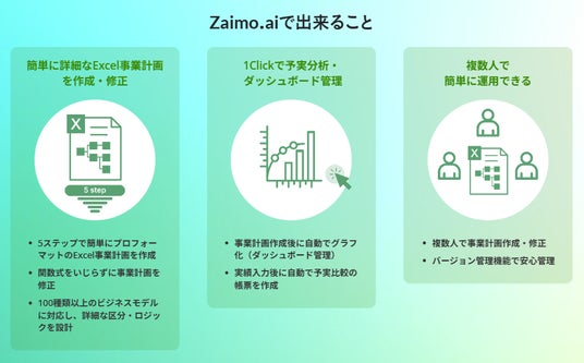 Zaimo․aiは、主にスタートアップのCFOや財務担当者、大企業の新規事業担当者が、簡単にExcel事業計画を作成し、予実管理体制の構築も行える経営管理プラットフォームです。100以上のビジネスモデルに対応し、5ステップでプロフォーマットのExcel事業計画作成や1Clickでのダッシュボード管理、予実比較などが可能です(Demo動画はこちら)。
