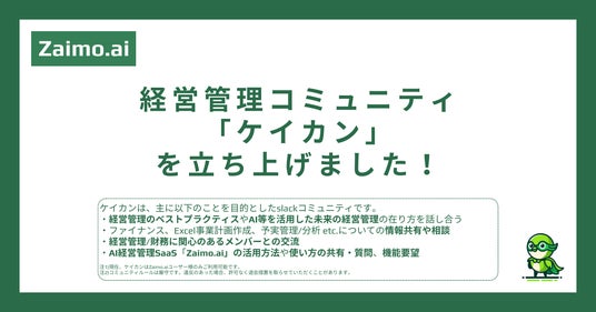 この度、経営管理の向上を目指すZaimo.aiユーザーの皆様にとって有益な情報とサポートを提供することを目的に、Slack経営管理コミュニティ「ケイカン」も設立いたしました。ケイカンでは、経営管理や資金調達に関するTipsの共有やZaimo․aiの使い方の相談、機能要望/フィードバック、ネットワーキングなどを行うことができます。経営管理の専門家から初心者まで、どなたでもご参加いただけますので、ご興味のある方は、Zaimo.aiにログイン後、メイン画面からご参加ください。ご参加を心よりお待ちしております。