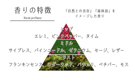 香りの特徴は、青々と生い茂った植物から抽出した香りで『自由な森林の中』 をイメージしています。実際に森林浴に訪れたように深呼吸をしたくなる ”落ち着く” 香りです。忙しくてなかなか森林に直接足を運べないそんな方でもフォレストグリーンの香りを纏うことで日常的に森林浴を楽しめます。心が揺らぎ、疲れを感じた時に一度立ち止まり一呼吸置くことでリセットされエネルギーが湧いてきます。まるで、自然のなかに身を置いているかのような感覚に。ウッディな香りに包み込まれ、毎日のリフレッシュへ繋がることを期待しています。