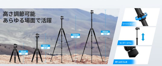 【調整可能で拡張可能】5段階に調節可能なカーボンファイバー製の脚には、クイックリリースツイストロックが搭載されており、折りたたんだ状態の高さは12.4インチです。作業高さは3.54インチから55.51インチまで、数秒で調整可能です。3段階の脚角度調整システムを備えており、様々な撮影シーンや条件に柔軟に対応します