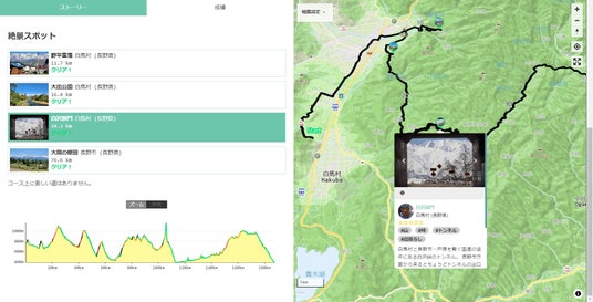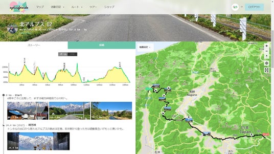 活動日記は、標高図とタイムラインに加え、サイクリングマップ上に自分が走ったコース、撮影した写真、記載したストーリーが掲載され、共有できるようになっています。
