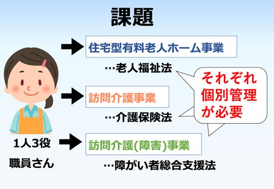 特定の住宅型介護事業者様は、個室住居サービスに加え、訪問介護、訪問看護、デイサービスを一体的に提供しています。このような包括的なケア体制を持つ事業者様は、職員に複数事業をまたがって兼務させることで労働生産性の向上を図れます。しかし、その反面、予定や実績の管理が非常に複雑化してしまいます。これまで、介護保険の二重請求を防ぐために、多大な手間をかけて資料作成や入念なチェックを行う必要があり、管理職員に大きな負担がかかり、現場の生産性が低下していました。