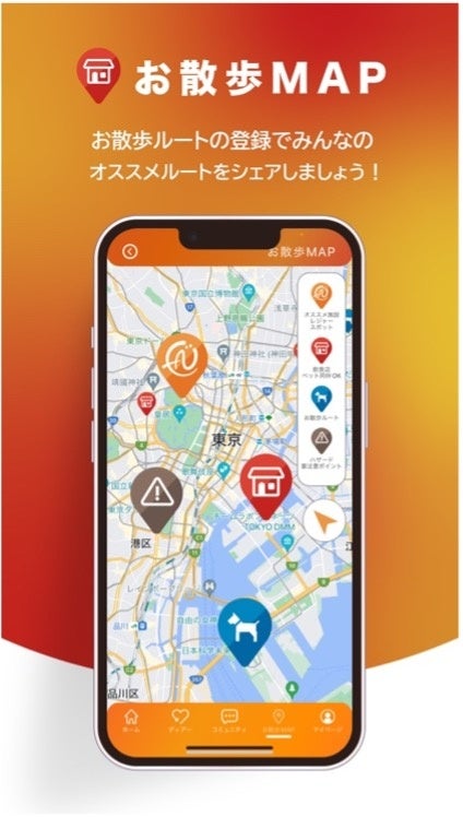 地域のお散歩ルートが分かります。お散歩ルート以外にも愛犬同伴可能のおすすめ施設、飲食店、ハザード情報も掲載。さらにお散歩ルートを登録してポイントを貯めることで、さまざまなプレゼントももらえます。