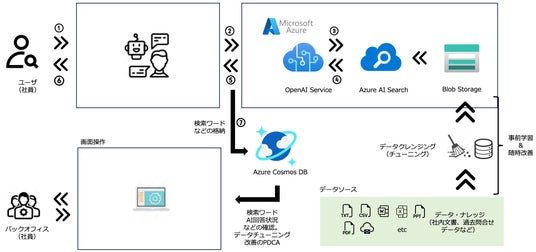 社内に寄せられた過去の問合せデータ、社内文書など適切にデータ加工を行いOpenAIに学習させ、チャットで社員からの問合せに応答するシステムです。