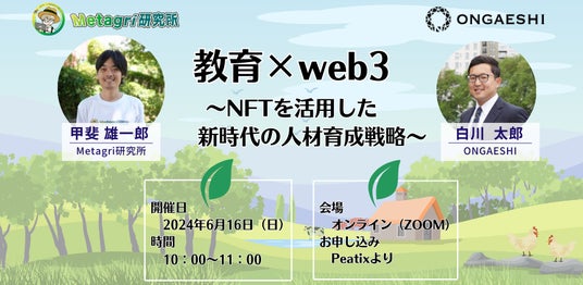 農業web3コミュニティ「Metagri研究所」(運営:株式会社農情人、本社:千葉県船橋市、代表取締役:甲斐雄一郎)は、教育格差の是正を目指すONGAESHI(オンガエシ)プロジェクトチーム(国内運営:Institution for a Global Society株式会社、以下「ONGAESHI」)と共同で「教育×web3~NFTを活用した新時代の人材育成戦略~」と題したオンラインセミナーを開催します。
