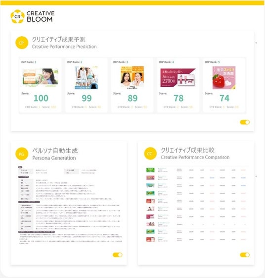 すでにグループ内で実装しているCreative Table PINGPONGを進化させ、クリエイティブの評価、自動生成、予測など、人と共創できるAIサービスを搭載し、クリエイティブ業務の効率化/高度化を支援するクリエイティブプラットフォームを提供。
