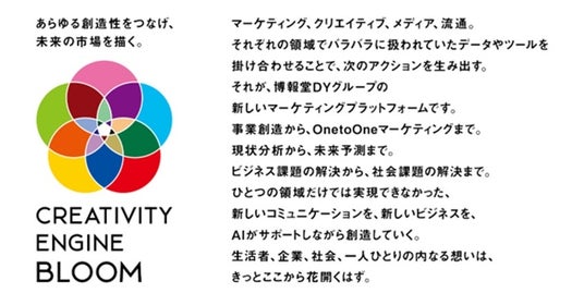 株式会社博報堂DYホールディングス(東京都港区、代表取締役社長:水島正幸、以下 博報堂DYホールディングス)は、マーケティングやクリエイティブ、メディア、流通など、これまでそれぞれの領域で個別に扱われていたデータやツールを掛け合わせ、統合マーケティング戦略立案やビジネス開発支援、社会課題解決のアクションを生み出す新しい統合マーケティングプラットフォーム「CREATIVITY ENGINE BLOOM(クリエイティビティ エンジン ブルーム)」を開発しました。