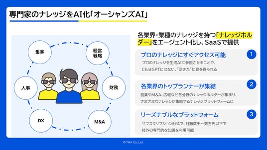 株式会社THA(本社:神奈川県横浜市、代表取締役:西山朝子)は、このたび、専門家の知識を活用し、簡単に専門的な回答を提供する新サービス「オーシャンズAI」をリリースすることを発表いたします。