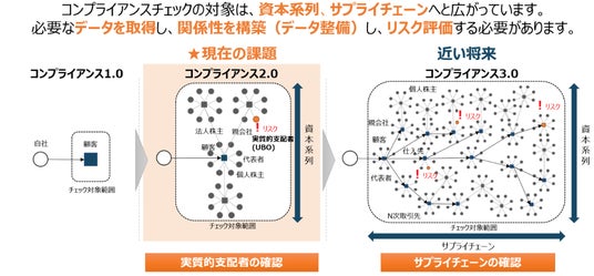 マネー・ローンダリング等の金融犯罪は、年々手口が巧妙化し、その規模も拡大しています。犯罪収益の凍結、差押えが困難な理由の1つに、フロント企業や架空取引などによる犯罪者の隠蔽があります。国内外の法令・ガイドライン等は、金融機関に顧客の実質的支配者や取引先を特定し、リスク評価することを求めています。しかし、その実行は容易ではありません。