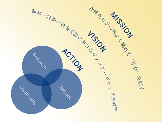 ミッションの実現のため、「科学・技術の社会実装におけるジェンダーギャップを解消」することでジェンダーギャップが残り続ける未来を予防します。具体的には、女性が少数の分野における当事者コミュニティの形成支援(Community)、科学・技術の社会実装におけるジェンダーギャップについての調査研究事業(Research)、ジェンダーギャップ解消に寄与する活動への支援(Support)に取り組みます。