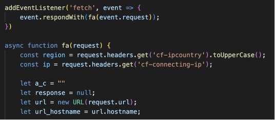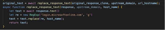 Netskope Threat Labsは、透過的フィッシングページの仕組みと防御方法をより深く理解するため、Cloudflareにホストされた透過的フィッシングページの一部を模倣しました。模倣したフィッシングページ全体は、オープンソースのCloudflare MITMツールキットの改造版を用いて作成しました。攻撃者は「Hello World」Workerテンプレートを用いてCloudflareアプリケーションを構成しますが、これはaddEventListener() メソッドを用いてfetchイベントをリッスンします。被害者が攻撃者のログインページにアクセスすると、攻撃者は、HTTPリクエストメソッド、地域、IPアドレス、ヘッダーを含むウェブリクエストメタデータを収集し、それを用いて被害者の代わりに正当なページへのリクエストを送信します。