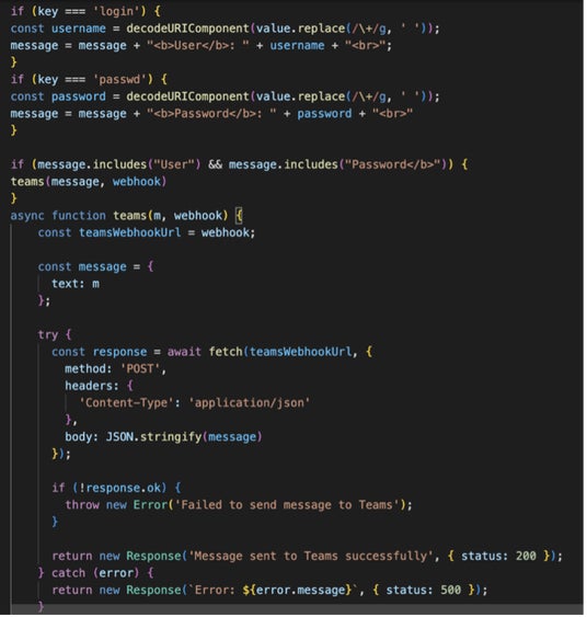 続いてアプリケーションは被害者のログイン認証情報を収集し、収集された情報はさらにCloudflare webhook通知またはHTTPを介して攻撃者に送信されます。被害者はログイン情報を入力すると正当なウェブサイトにログインし、攻撃者はレスポンスに含まれるトークンとクッキーを収集します。また、被害者がログイン後にさらにアクションを行った場合、攻撃者はこれも把握できます。
