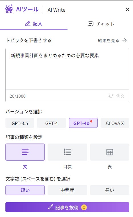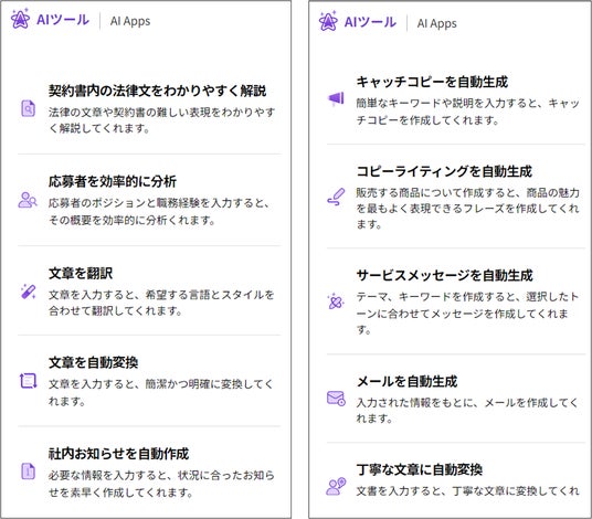 AI Appsには、より簡単にAIを使いこなすためのテンプレートが用意されています。項目を入力するだけでAIへの効果的な質問が完成、適切な回答を得られます。この技術には多くの日本企業に導入されているAllganize Japan社の技術を採用。AI生成精度、日本語認識など強みがあります。 テンプレートの一例