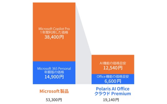 Microsoft 365の半分以下の価格、さらにPremiumは充実したAI機能を使えて2万円以下で済みます。