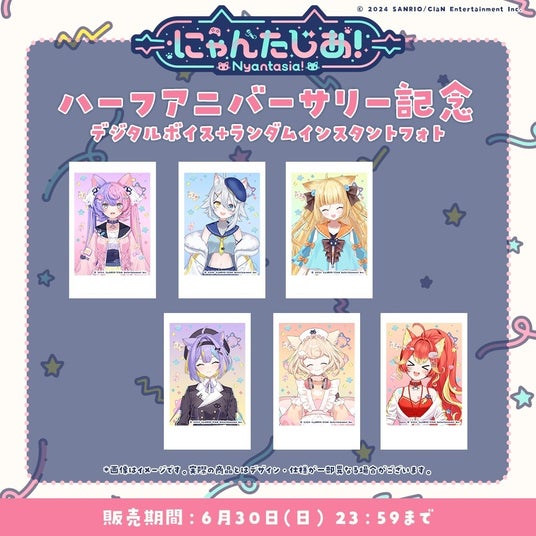 株式会社ClaN Entertainment(本社:東京都港区、代表取締役社長:大井 基行)は、株式会社サンリオ(本社:東京都品川区、以下サンリオ)と共同で行うVTuberプロジェクト「にゃんたじあ!」において、「にゃんたじあ!ハーフアニバーサリー記念 デジタルボイス+ランダムインスタントフォト」を2024年6月1日(土)20:00から2024年6月30日(日)23:59までの間、公式BOOTHにて販売することをお知らせします。