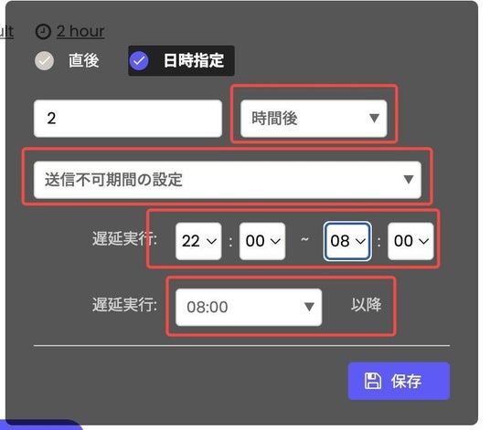 午後10時以降翌朝8時までに予定されている配信は、すべて8:00以降に配信が繰り延べられる仕様でした。また「n時間後」の場合も同様に配信時間を計算します。