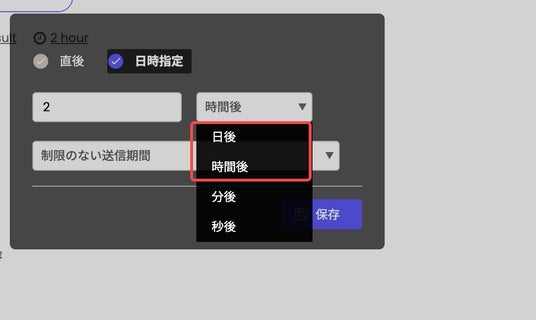 「日後」「時間後」を選択した場合は、以下の3パターンから選んでいただけます(「分後」「秒後」の場合は設定できません)。