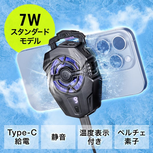 スマホクーラー スタンダードモデル 7W出力 ペルチェ素子 クリップ固定 静音 冷却 コンパクト 軽量 冷却ファン USB Type-C給電 温度表示付き iPhone Android
