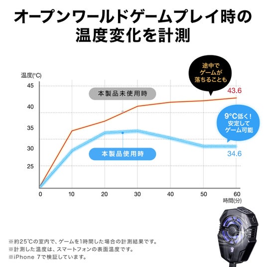 ●処理の重たいゲームや、高画質の動画撮影中の温度上昇を防ぎ、スマホの動作を安定させます。