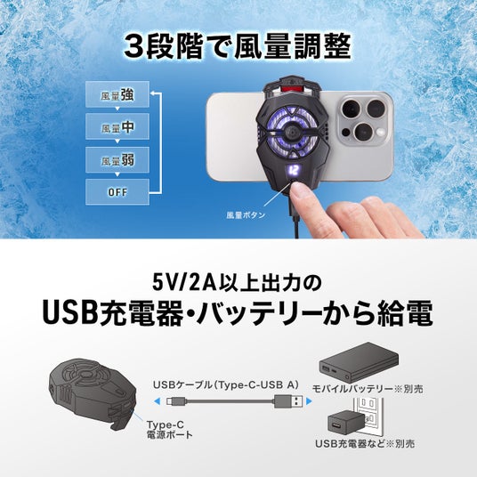 ●クーラーの電源はUSB Type-Cコネクタを採用。付属のケーブルでUSB充電器やモバイルバッテリーと接続することで給電可能です。