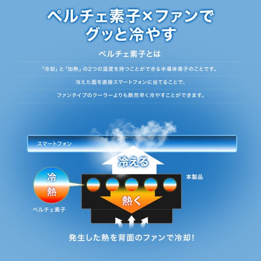 ●ペルチェ素子の力でスマホを瞬間冷却するスマートフォンクーラーです。