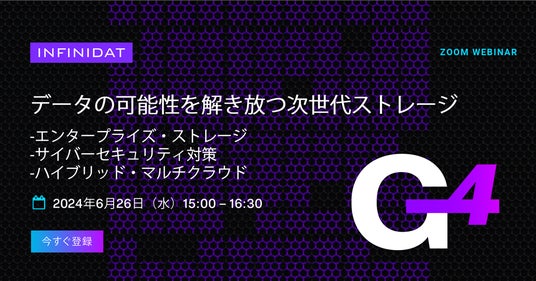 INFINIDAT Japan合同会社は、本年5月に発表した次世代ストレージ製品InfiniBox(R) G4ファミリーをご紹介するWebinar「データの可能性を解き放つ次世代ストレージ」を6月26日(水)に開催します。