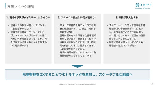 そのため、それぞれの現場の状況を適切に把握し作業の改善をしたり、現場作業員の教育をして作業の質を向上するといったコア業務に集中しづらい状況になっています。
