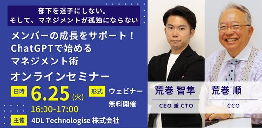 4DL Technologies 株式会社(本社:千葉県千葉市、代表取締役CEO兼CTO:荒巻 智隼、以下「4DL」)は、4DL ChatGPTを活用したチームアセスメントのサービス開始に先立ち、2024 年 6 月 25 日 16 時より無料オンラインセミナー《~部下を迷子にしない。そして、マネジメントが孤独にならない~メンバーの成長をサポート!ChatGPT で始めるマネジメント術》を開催します。申込みフォーム