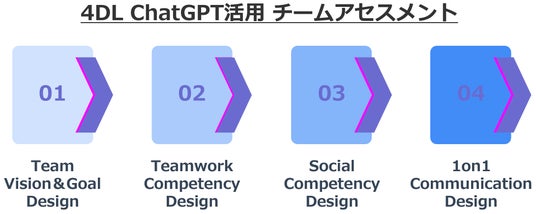 4DL ChatGPT活用チームアセスメントは以下の4つのプロセスを、それぞれのチームのおかれている状況、マネジメントの考え、組織からおりてきているテーマ、そしてメンバーそれぞれの個性も含めた持ち味をChatGPTで分析をして、最終的にはチームの生産性向上に寄与する生成AIソリューションです。