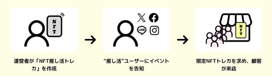 「推し活★トレカ」は「推し活」と「NFT」を組み合わせ、店舗やイベントの集客促進を目的に開発されたシステムです。店舗のオーナー様やイベントの主催者様が、推し活ユーザーに向けて魅力的で新しい集客体験を提供できます。