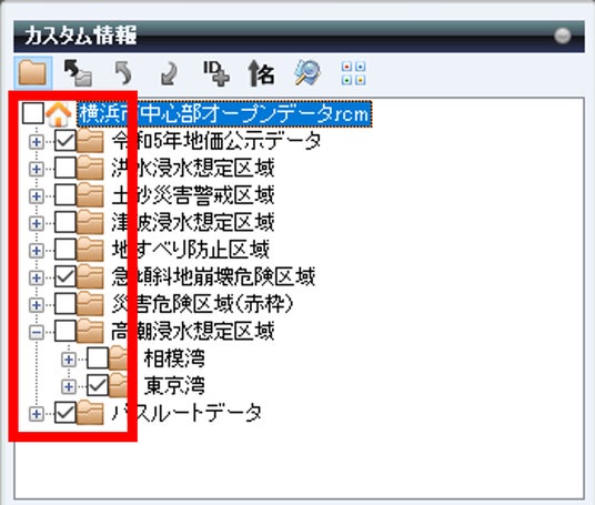 行政区域強調表示機能を拡張し、これまで1つだけしか選べなかった行政区域を複数選択して強調表示ができるようになりました。さらに、選択指定した行政区域内に含まれる店舗や顧客などの管理情報をワンタッチで抽出できる機能、地図上に表示したい情報フォルダをチェックボックスでON/OFFできる機能を追加したことで、顧客管理や商圏分析などにもかんたんにお役立ていただけます。