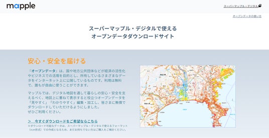 各所で公開されているオープンデータの種別と有用性を知ってもらうことを目的に、無償でご利用いただけるダウンロードサイト(https://biz.mapple.com/smd-rcm/)を新たに開設します。