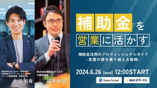 株式会社Sales Crowd(本社:東京都品川区、代表取締役:水畑 裕貴、以下:当社)は、会員数30,000名を超える国内最大級の公的支援メディアを運営する「株式会社補助金ポータル」の代表取締役 福井氏をお招きし「補助金活用のプロフェッショナルガイド~営業の壁を乗り越える戦略~」セッションセミナーを2024年6月26日(水)12:00より開催します。