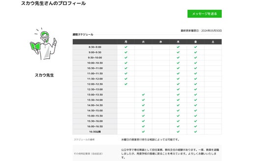 学校ユーザーから見た教員ユーザーの週間空きスケジュールの画面(プロフィール画面の一部を表示)