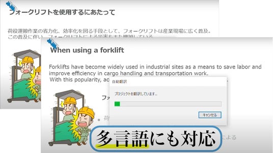 ドキュメントで作成したマニュアルはもちろん、動画内に挿入されたテロップも自動で翻訳可能です。製造現場や工場、店舗等での動画マニュアルにも活用いただけます。