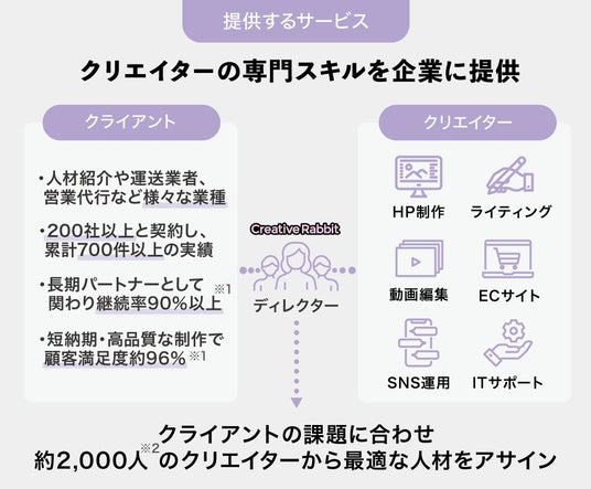 クライアント企業の課題に合わせて、約2,000人の登録クリエイターの中から条件に合った人材を選び、クリエイティブを制作することができます。