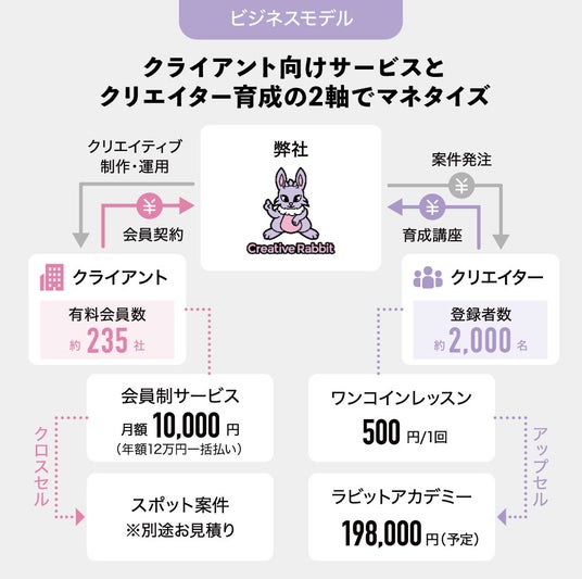 弊社は、会員制クリエイティブサービスとクリエイター育成の2つで収益化しています。
