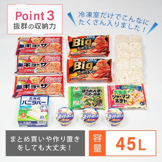 一人暮らしや二人暮らしには十分な量の冷凍食品や作り置きを保管することができます!